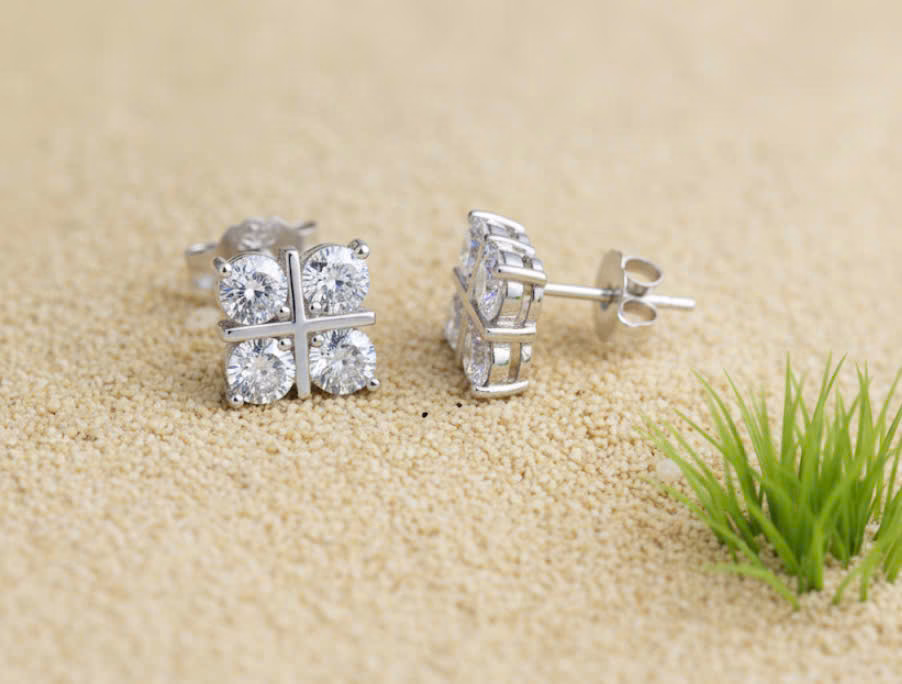 Crafted with platinum-plated sterling silver posts and adorned with four sparkling Moissanite stones.