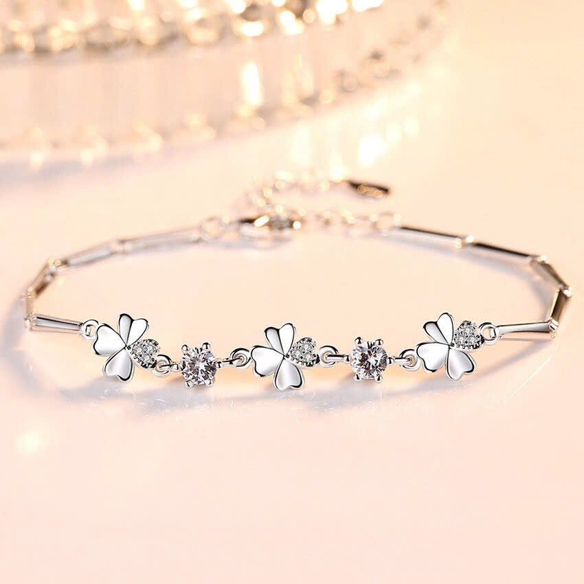 Set in white gold-plated silver, two radiant 0.5-carat Moissanite diamonds sparkle like dew on morning clover leaves—fresh, bright, and full of promise. With an adjustable length, it wraps effortlessly around your wrist, catching the light and hearts alike.