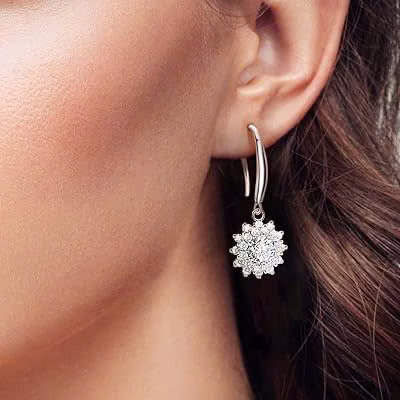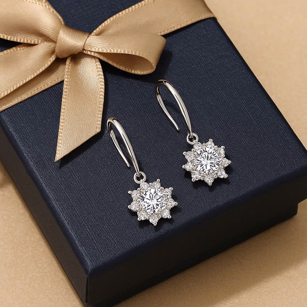 At the heart of each earring lies a Moissanite diamond, surrounded by a halo of shimmering Zirconia—a constellation of elegance that lights up your presence. Their lightweight drop design dances gently with your every move, bringing grace without effort.